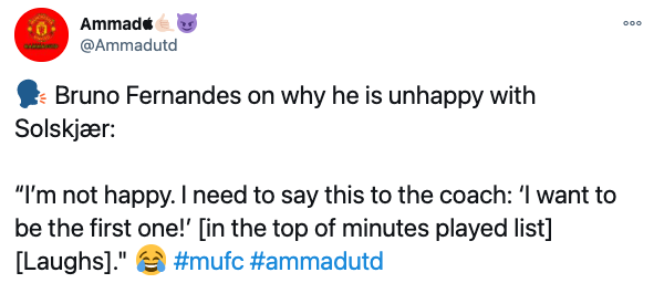 브루노 페르난데스 "난 행복하지 않다. 코치에게 이렇게 말하고 싶다." "출전 시간 1위 시켜주세요!!ㅋㅋㅋ" (대체 얼마나 혹사 당하길 원하는 거냐ㅋㅋㅋㅋ)