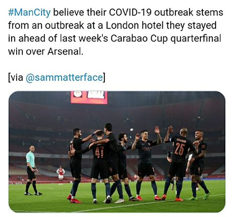 선수단 절반이 감염된 맨시티의 코로나 사태.. 카라바오컵 아스널전을 위해 묵었던 런던 호텔에서 감염 시작ㄷㄷ