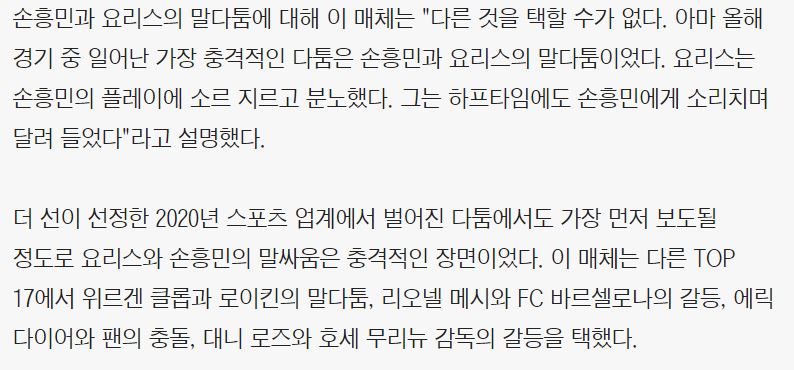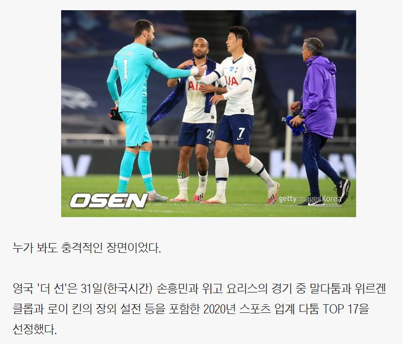 [손흥민-요리스 다툼, 2020년 스포츠 업계 충격 장면 선정...]