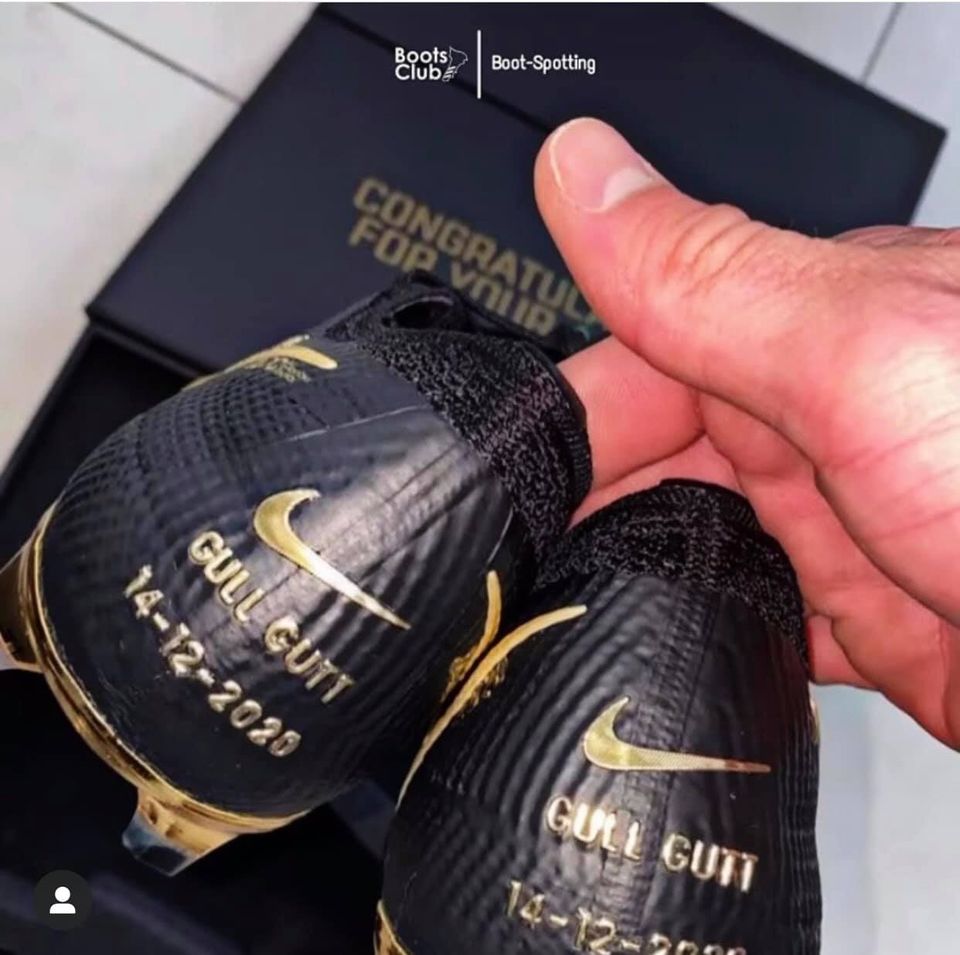 축구화에는 노르웨이 국기, 홀란드의 이름 그리고 골든 보이를 의미하는 노르웨이어 'GULL GUTT'와 골든 보이 수상 날짜인 20년 12월 14일이 적혀있습니다.