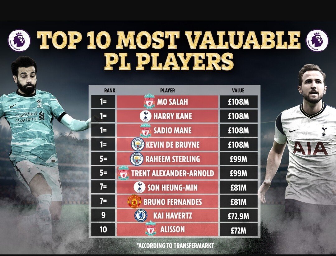 출처 : https://www.thesun.co.uk/sport/football/13657388/premier-league-top-10-most-valuable-players/