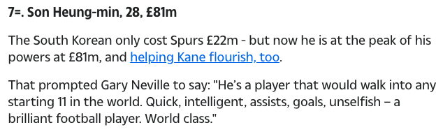 [손흥민에 대한 코멘트] 한국인 선수는 고작 22M에 토트넘 합류. 그러나 지금은 81M으로 몸값의 피크를 찍고 있고 케인의 성공을 도왔다. 이로 인해 게리 네빌은 "손흥민은 전 세계 베스트 11에 포함 가능한 선수다. 빠르고 지능적이며 어시스트, 골, 이기적이지 않은 뛰어난 축구 선수다. 월드 클래스 선수"라고 평가했다.