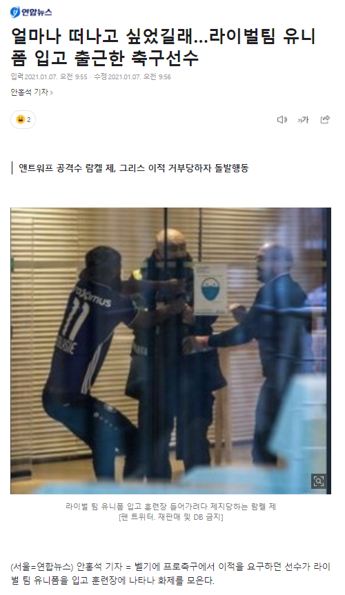 앤트워프 소속 공격수 디디에 람켈 제 선수는 그리스 파나티나이코스로의 이적을 앤트워프 구단이 허락하지 않자 라이벌인 안더레흐트의 보라색 유니폼을 입고 당당히 훈련장에 나타났다.
