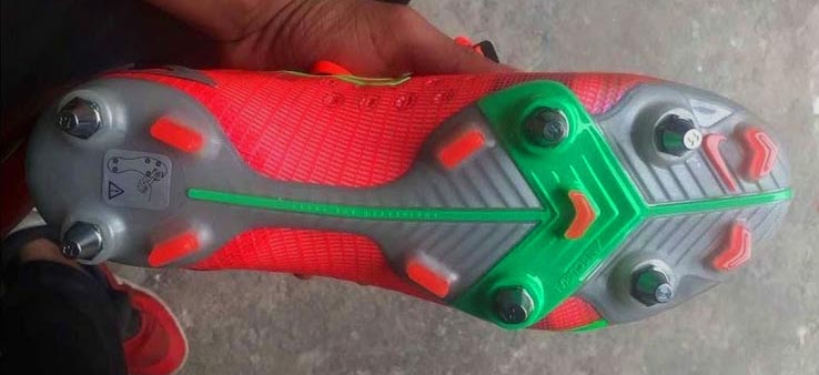 그리고 중족부와 토박스에는 구멍이 난 구조가 안쪽으로 배치되어 있는 모습을 확인할 수 있는데요. 이외에도 플라이니트, ACC와 같은 기존의 기능을 설명할 문구들도 확인되며 SG 모델로 보이지만 아웃솔이 분리형이 아니라는 점, 전작 에어로트랙 존이 살짝 변경된 점, 축구화 바닥 중앙이 길게 가로지르는 지지대가 추가된 점이 발견됩니다.