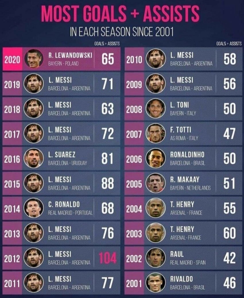 2001년 이후 최다 공격포인트 올린 선수들. 2009년부터보면 메시 9번이고, 레반수지날두 각 1번씩 (이렇게보니 기록 차이가 크게 나네요)