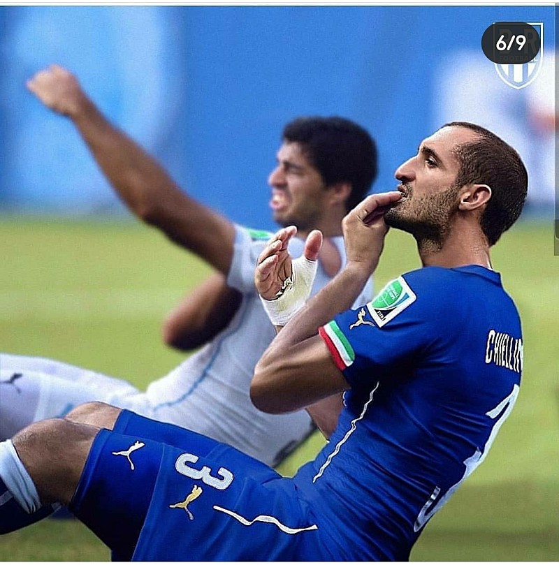 핵이빨 키엘리니.. 키엘리니는 경기 내내 부딪히던 수아레스의 어깨를 이빨로 문다