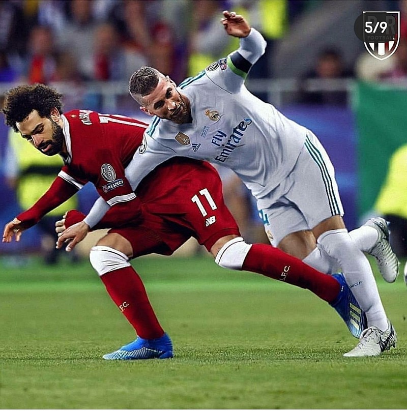챔스 결승에서 라모스의 팔을 잡아채는 살라. 라모스는 팔 부상으로 챔스 결승 도중 교체 아웃된다