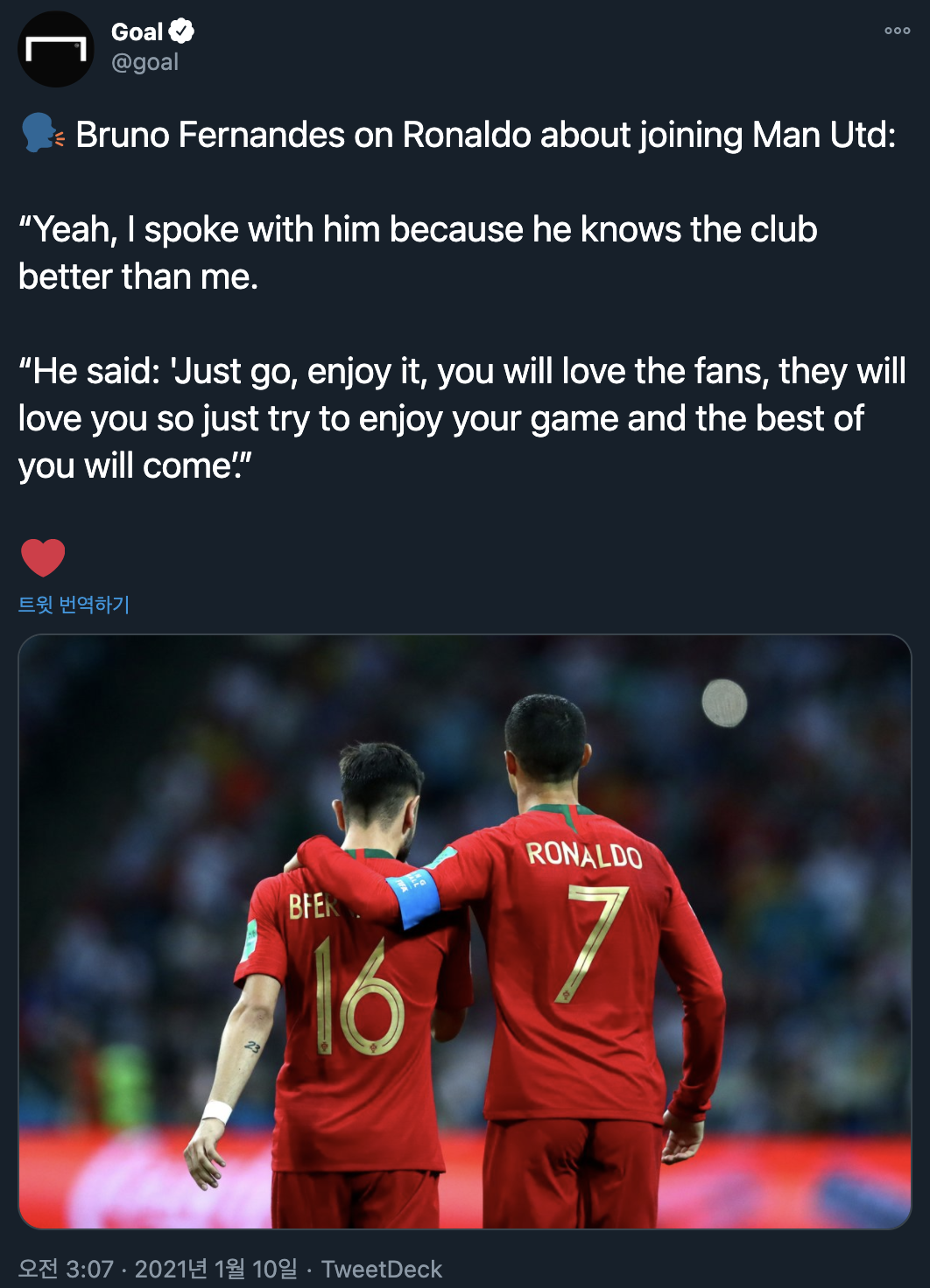 브루노는 맨유로 이적하기 전에 호날두에게 물었다 그가 나보다 맨유에 대해 잘 알기 때문에 호날두에게 물어봤어요. 호날두는 "그냥 즐겨, 거기 팬들이 마음에 들거야, 팬들도 너를 좋아해줄 것이고. 그러니 가서 즐기고 노력하면 좋은 결과가 있을 거야"라고 나에게 조언해줬습니다.
