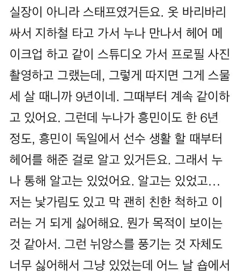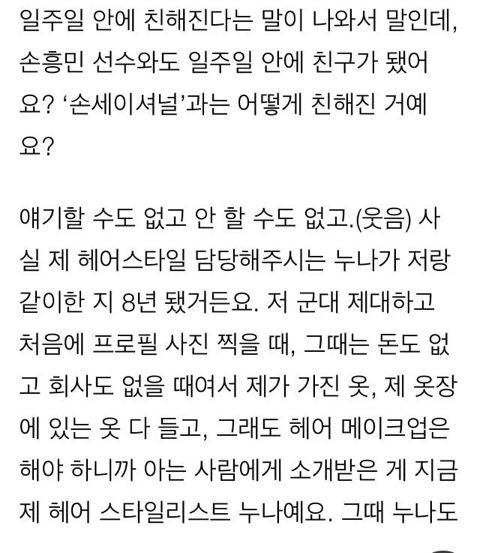 요약하면 박서준 데뷔초부터 해주신 가족같은 헤어쌤이 몇년전부터 손흥민도 담당하심 서로 헤어쌤 통해 이야기만 듣던 사이였고 딱히 친분은 없었는데 박서준 독일 화보 찍으러 갔을 때 헤어쌤도 같이가서 거기서 헤어쌤이랑 같이 손흥민 만나고 그 후로 친분 생김 (아마 2018년 정도로 추정)