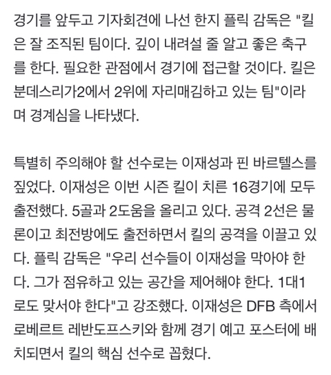 [바이에른뮌헨 플릭 감독 "이재성 막아야한다"]