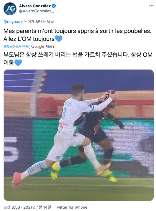 PSG에게 패배 후 마르세유 소속 알바로 곤잘레스의 트위터 사진과 멘트 "부모님은 항상 쓰레기 버리는 법을 알려주셨습니다."