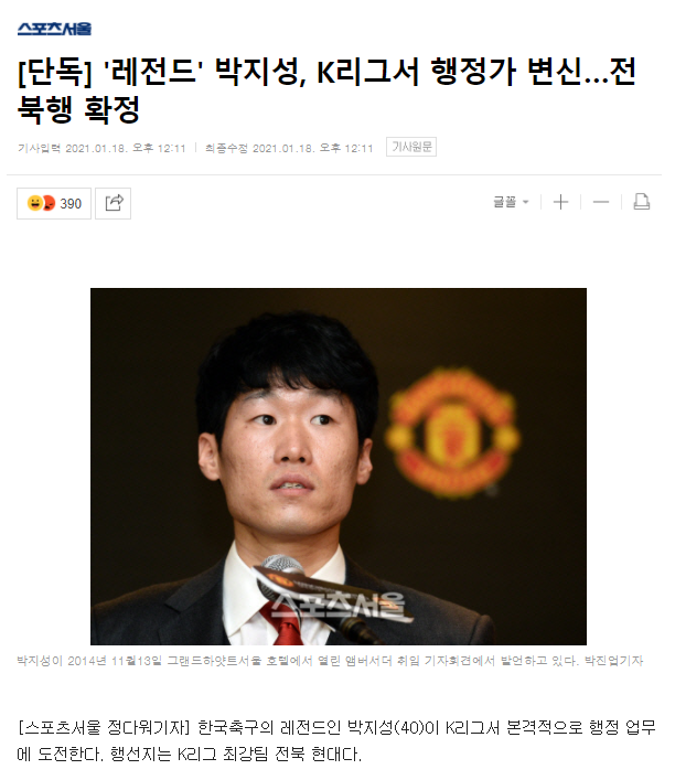 [[단독] '레전드' 박지성, K리그서 행정가 변신…전북행 확정]