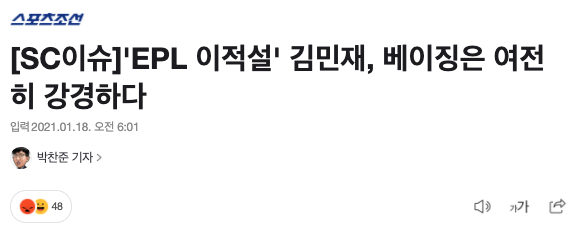 스포츠조선 취재 결과, 프랭크 램파드 감독은 지난 여름부터 김민재 영입에 관심을 갖고 있었던 것으로 전해졌다. 첼시, 아스널 모두 수비 보강을 원하는 팀들인만큼 김민재 영입은 충분히 가능한 시나리오다.