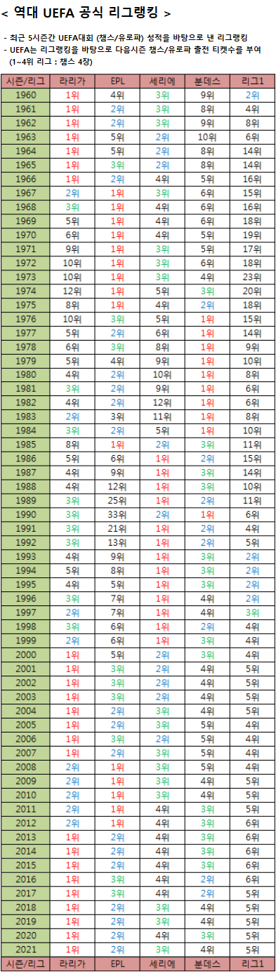[역대 유럽 축구 리그 '랭킹 정리']