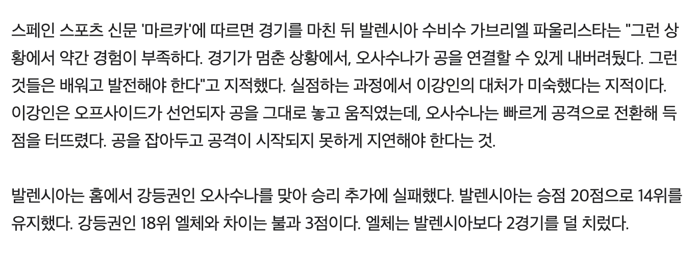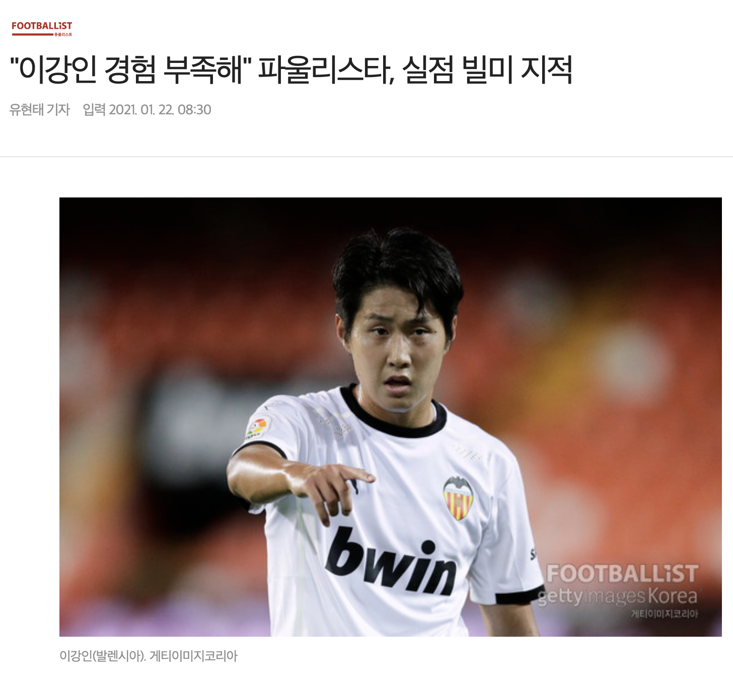 동료 수비수 "이강인은 경험이 부족하다" 실점 빌미 지적