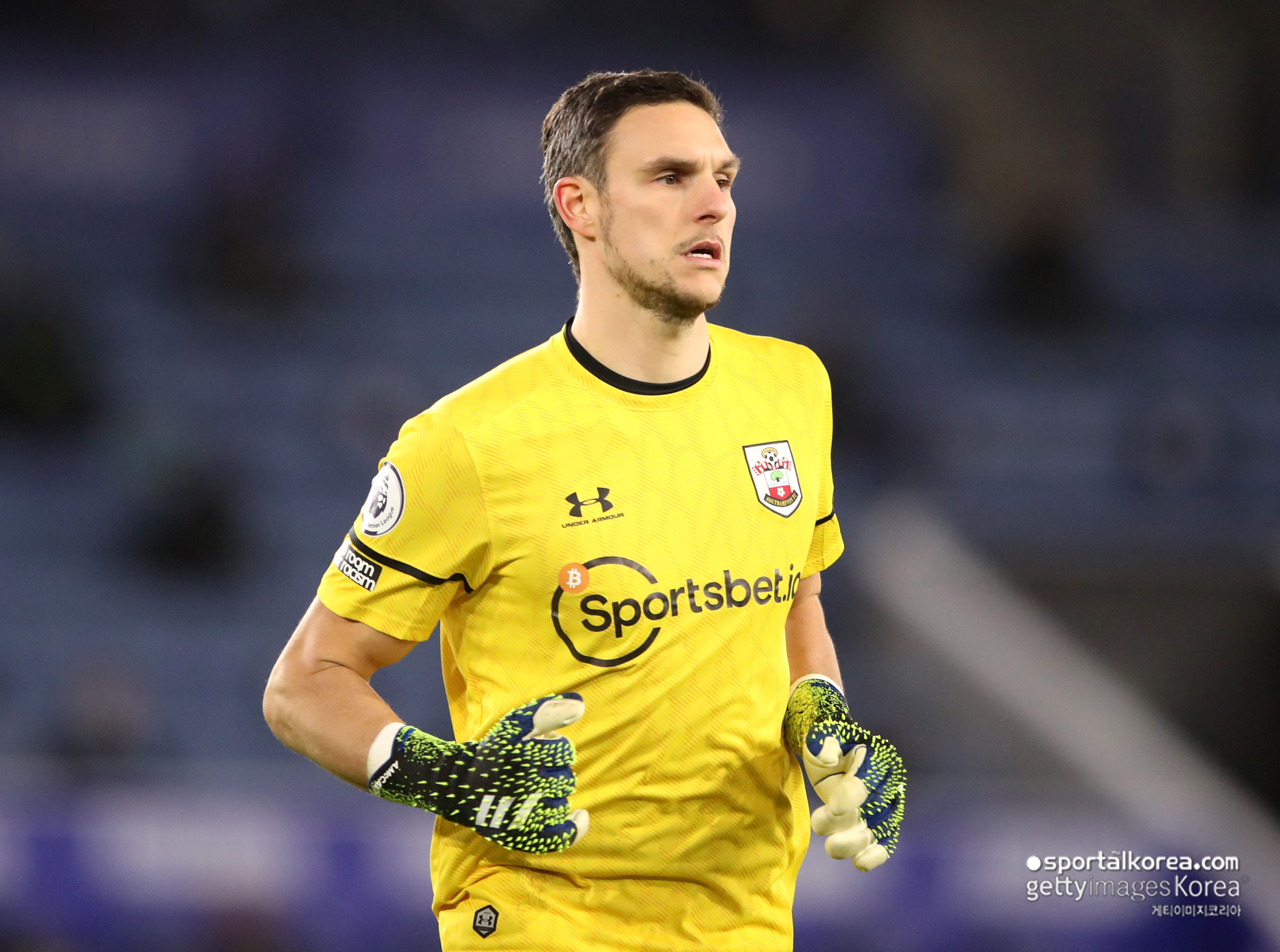 사우샘프턴의 골키퍼 '알렉스 맥카시'는 신제품 골키퍼 글러브를 착용했습니다.