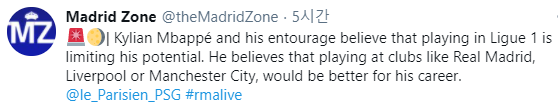 <르 파리지엥> 음바페와 그의 측근은 리그앙에서 뛰는게 음바페의 잠재력을 제한하고 있다고 믿는다. 그는 레알 마드리드, 리버풀 그리고 맨체스터 시티 같은 클럽에서 뛰는게 그의 커리어에 더 도움이 될거라 생각한다.