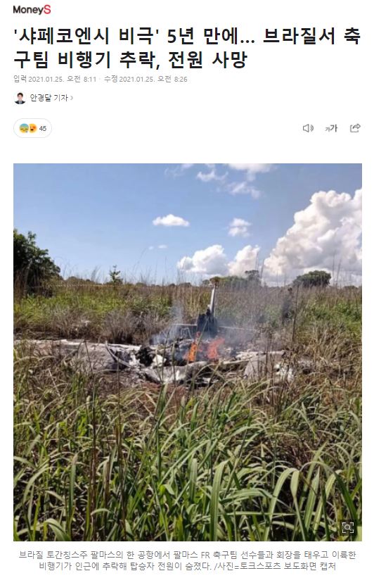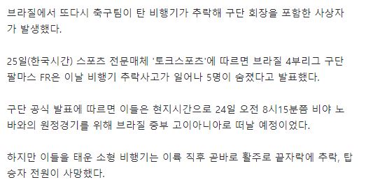 ['또 다시 비극' 브라질서 축구팀 비행기 추락, 전원 사망]