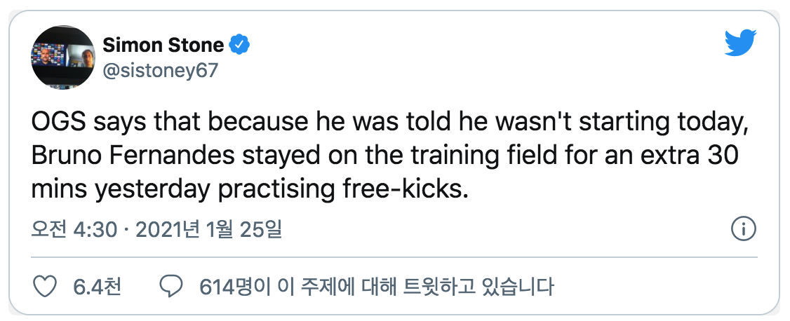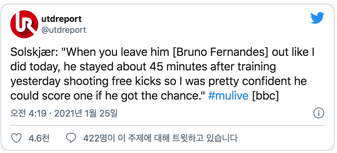솔샤르 "브루노는 어제 훈련이 끝나고 본인 스스로 훈련장에 남아, 30~45분 동안 프리킥 연습을 했습니다"