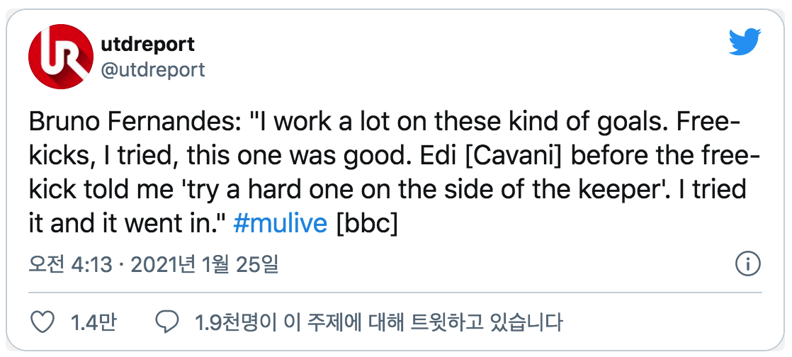브루노 "프리킥을 차기 전에 카바니가 저에게 '니어포스트가 아닌, 골키퍼 쪽 파포스트로 강하게 차봐'라고 조언을 해줬니다. 그의 조언을 따랐고 성공했네요!"