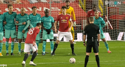 리버풀의 미드필더 티아고 알칸타라에게 24일 올드 트래포드에서 열린 맨체스터 유나이티드와의 경기에서 브루노 페르난데스가 프리킥에서 몸을 사렸다는 논란이 가득하다.