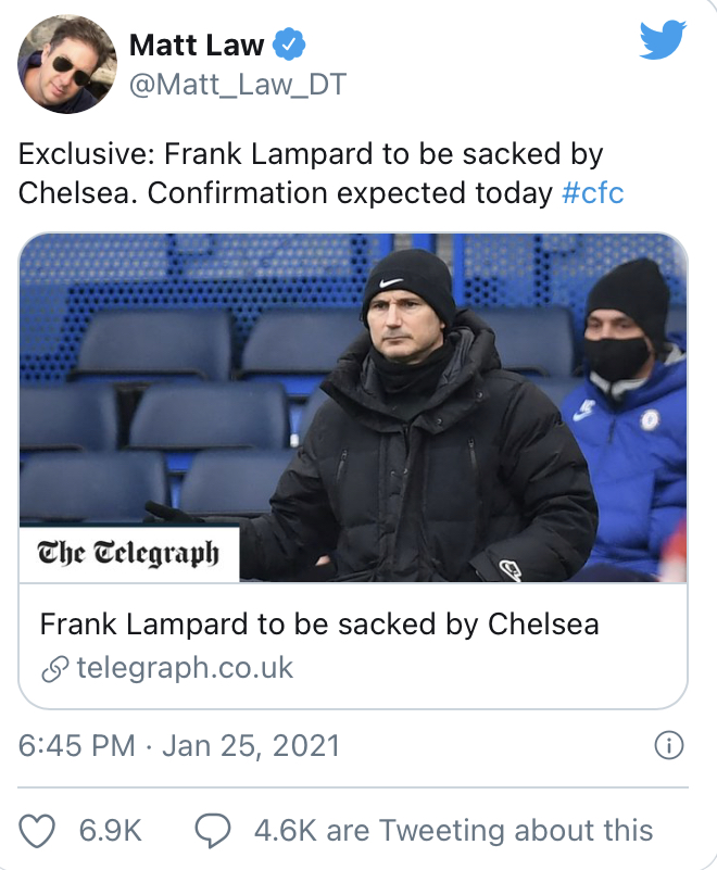 첼시는 램파드를 경질함. 오늘중 발표날 예정.