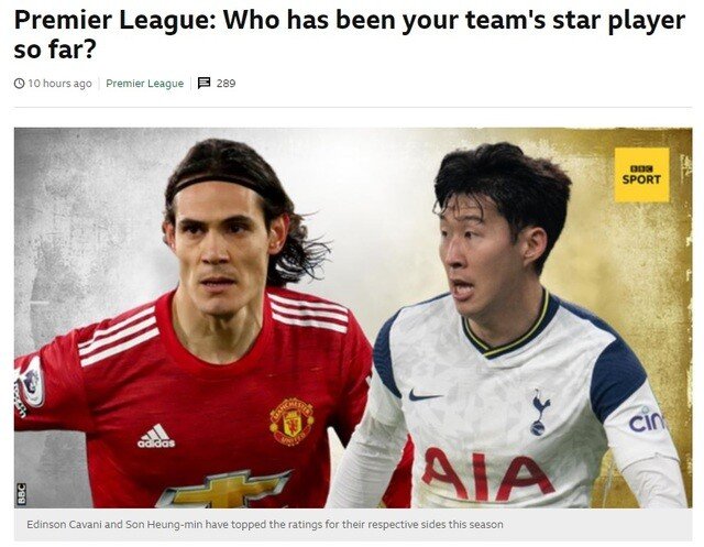 손흥민이 BBC가 선정한 20/21 시즌 EPL 전반기 팀별 최고 평점에서 토트넘 1위를 기록