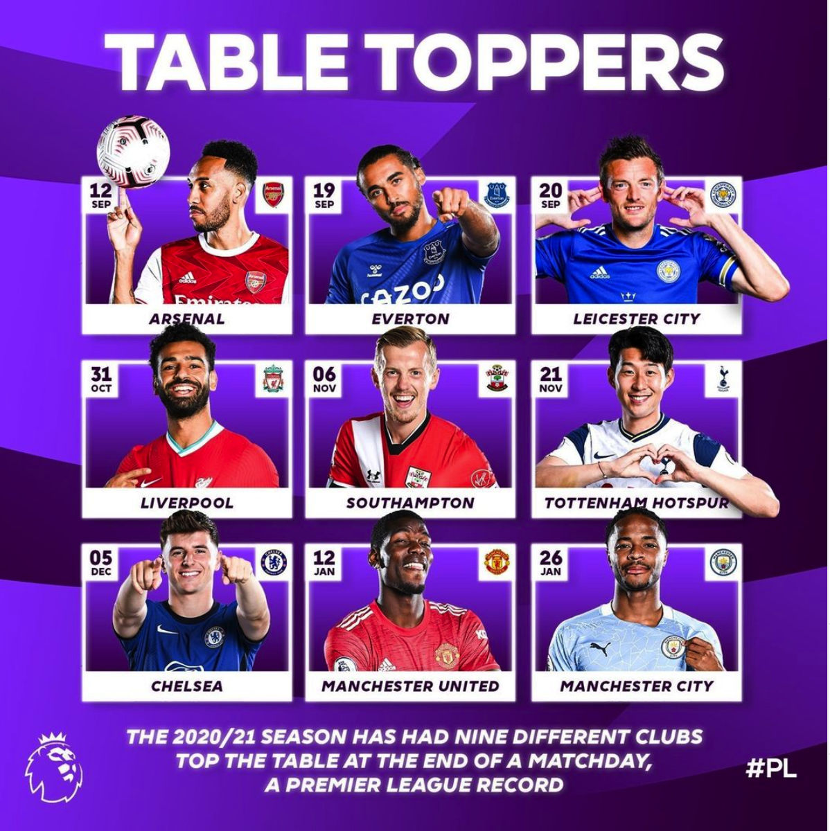 20/21시즌 매치 데이마다 9개의 다른 클럽이 리그 1위를 기록함