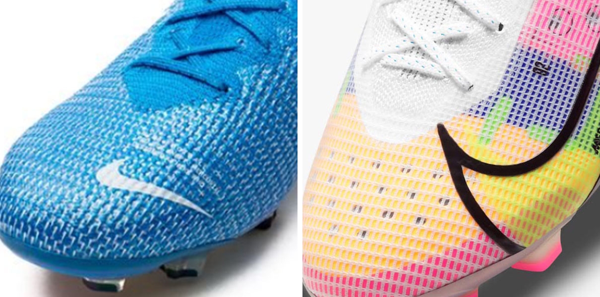 2021 머큐리얼의 주요 변경 사항은 어퍼입니다. 이전 머큐리얼의 어퍼는 플라이니트 소재가 촘촘하게 짜여 있었지만 새로운 머큐리얼의 'Vaporposite’ 어퍼는 플라이니트 소재의 간격이 생겼습니다. 진정으로 필요한 소재만 남겨 무게를 절감했습니다.