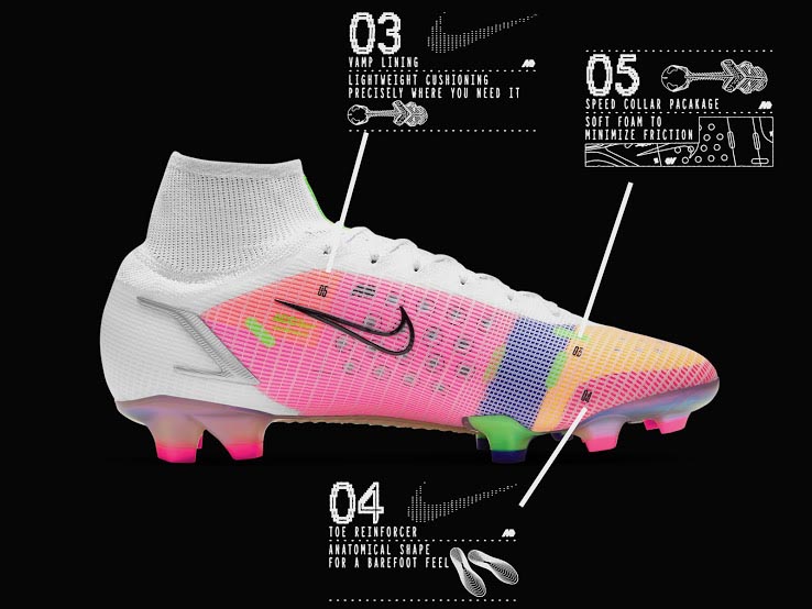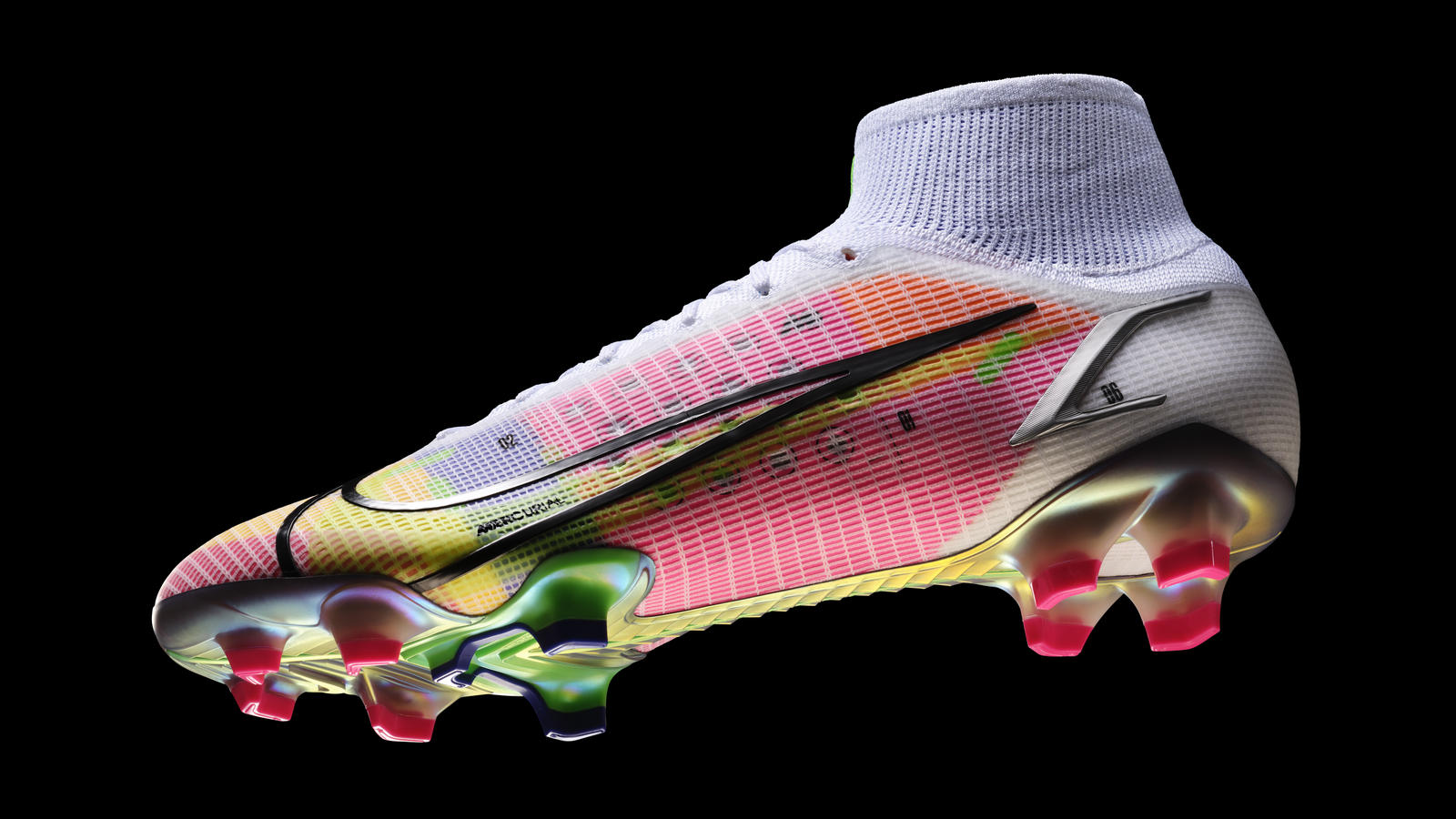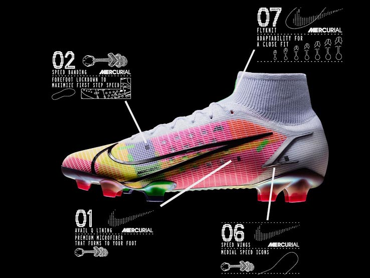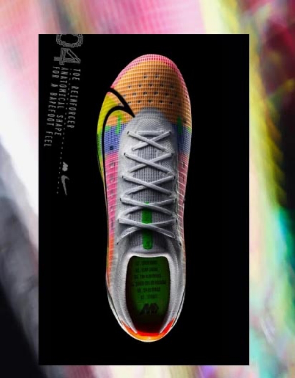 2021 머큐리얼의 런칭 컬러는 23년 머큐리얼 역사에 경의를 표하기 위해 컴퓨터 ‘마더보드(motherboard)’에서 영감 받은 디지털 사이키델릭 색상들로 디자인됐습니다.