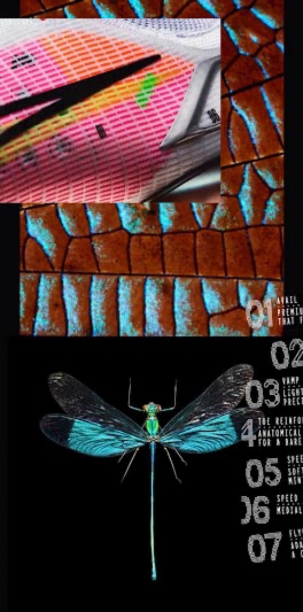 새로운 머큐리얼의 디자인은 최소한의 무게로 최대의 효율성을 이끌어 내는 것이 목표였고 그 영감을 잠자리(Dragonfly) 날개의 기하학적 구조에서 얻었습니다. 그 결과 7가지 주요 구성 요소로 분리된 가볍고 효율적인 축구화가 탄생했습니다.