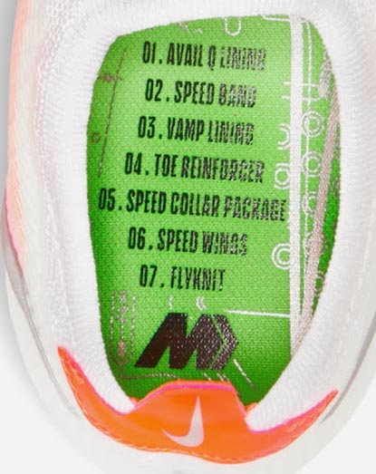 특정 부위에 적혀있는 01~07은 새로운 머큐리얼의 ‘7가지 특징’을 표시한 것이라고 하는데요. 머큐리얼을 착용한 선수가 더욱 빠르게 움직일 수 있도록 도와주는 기술을 표시한 것이라고 합니다.