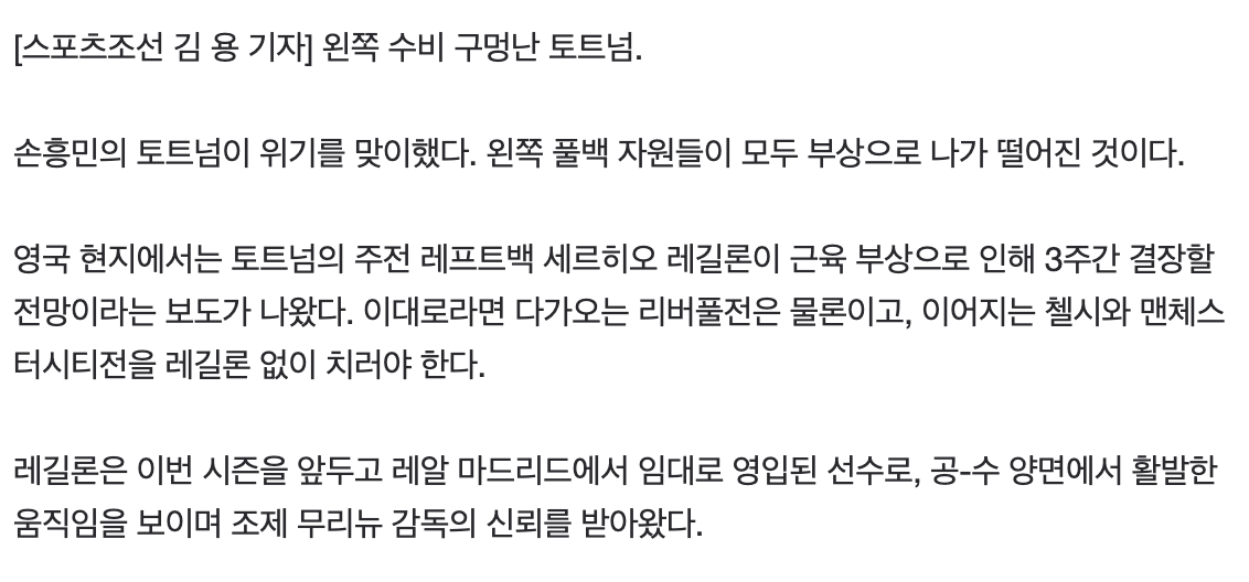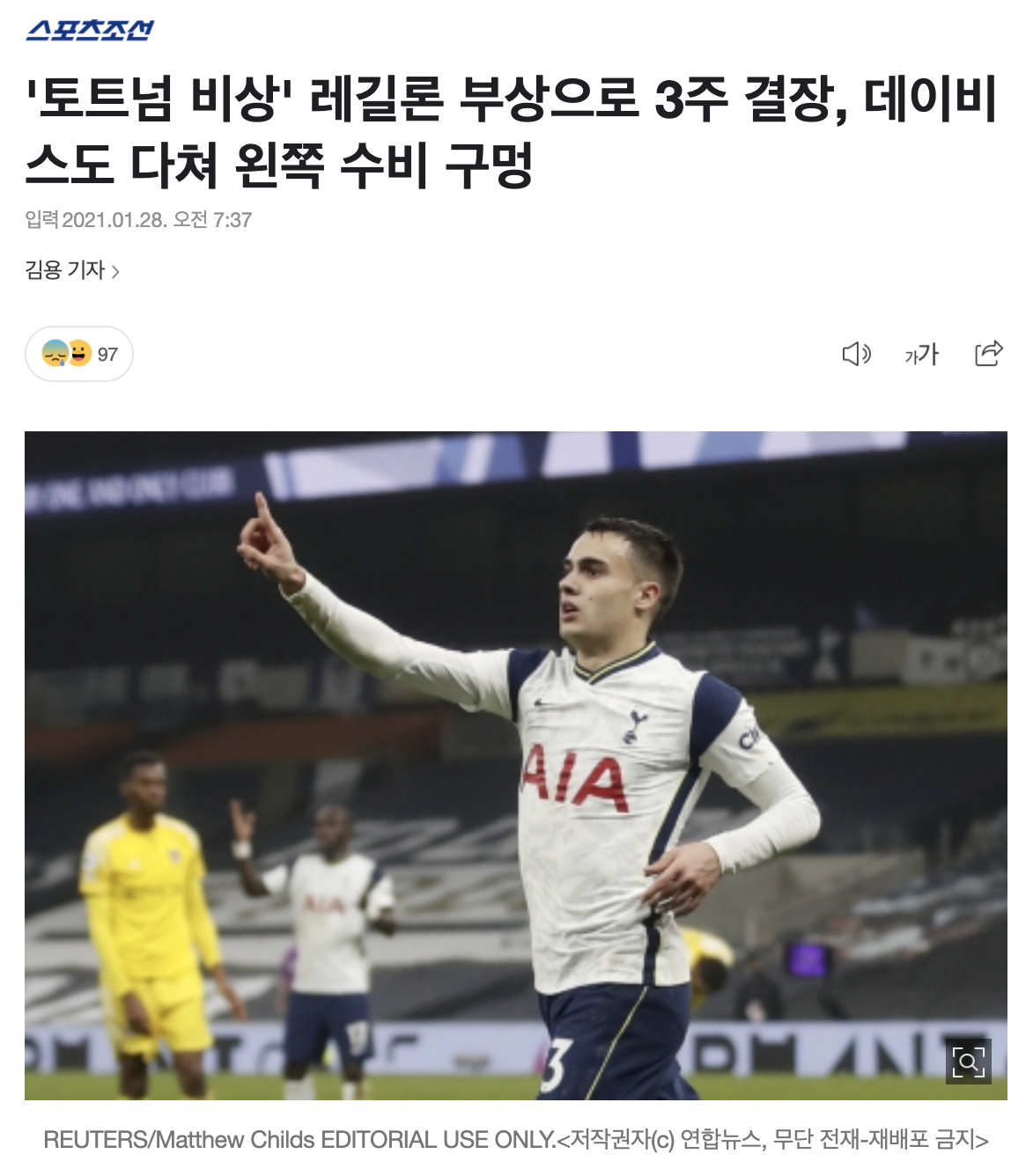 | 토트넘 비상.. 레길론 부상으로 3주 결장, 데이비스 역시 부상 | |