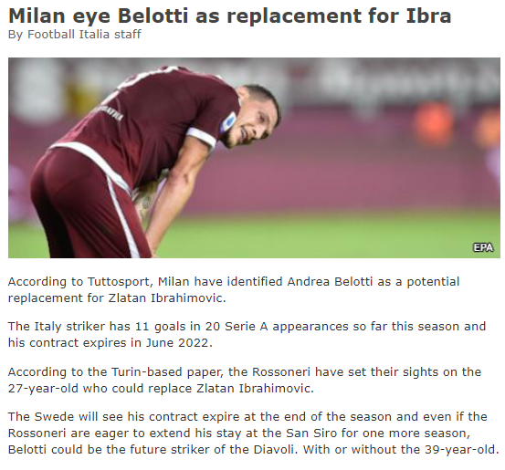 (기사 전문: https://www.football-italia.net/166223/milan-eye-belotti-replacement-ibra )