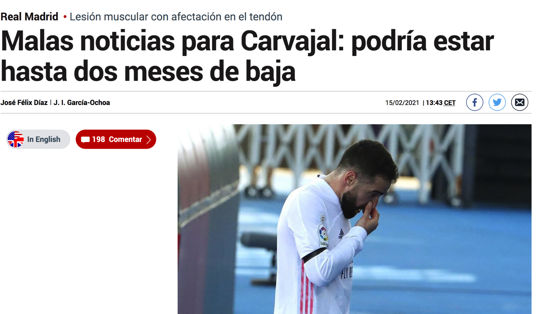 최악의 뉴스다. 카르바할은 힘줄 부상을 입었다.