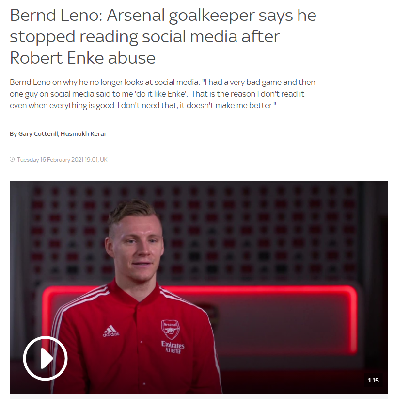 [아스날 골키퍼 레노가 SNS를 보지 않는 이유]