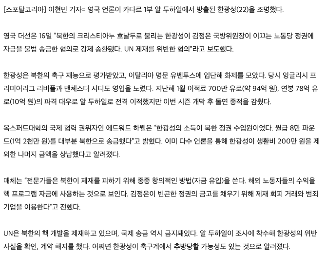 北, 한광성에게 월 1억 받아 핵 자금 충당