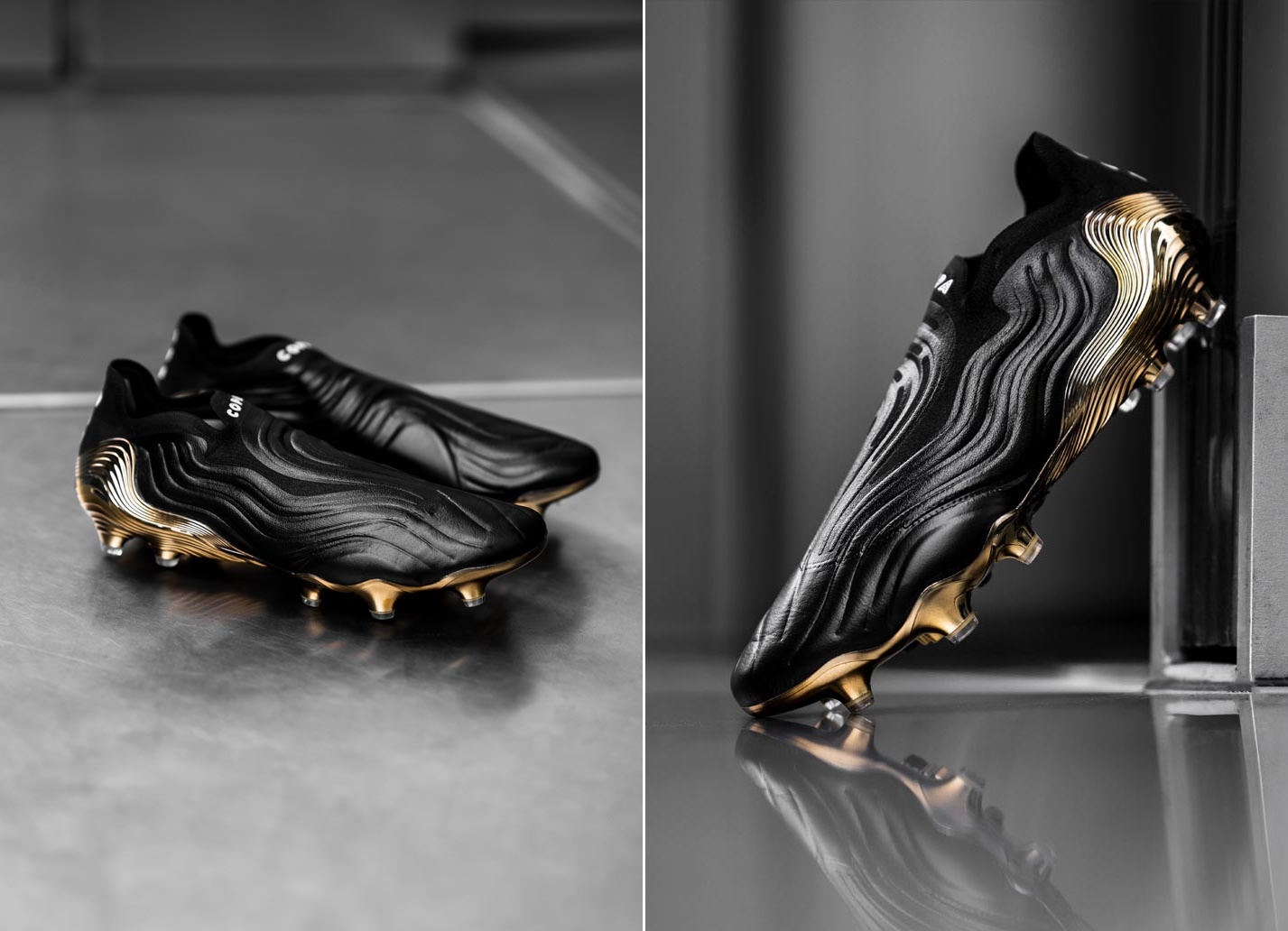 새로운 아디다스 코파 센스의 런칭 컬러는 전체적으로 블랙 컬러의 어퍼에 아웃솔은 크롬 코팅된 골드 컬러로 제작되어 고급스러우면서도 클래식합니다.