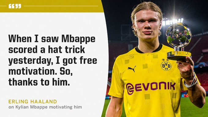 엘링 홀란드 - 어제 음바페 해트트릭한거 보고 엄청 자극이 됐다. 그에게 감사하다고 전하고 싶다.