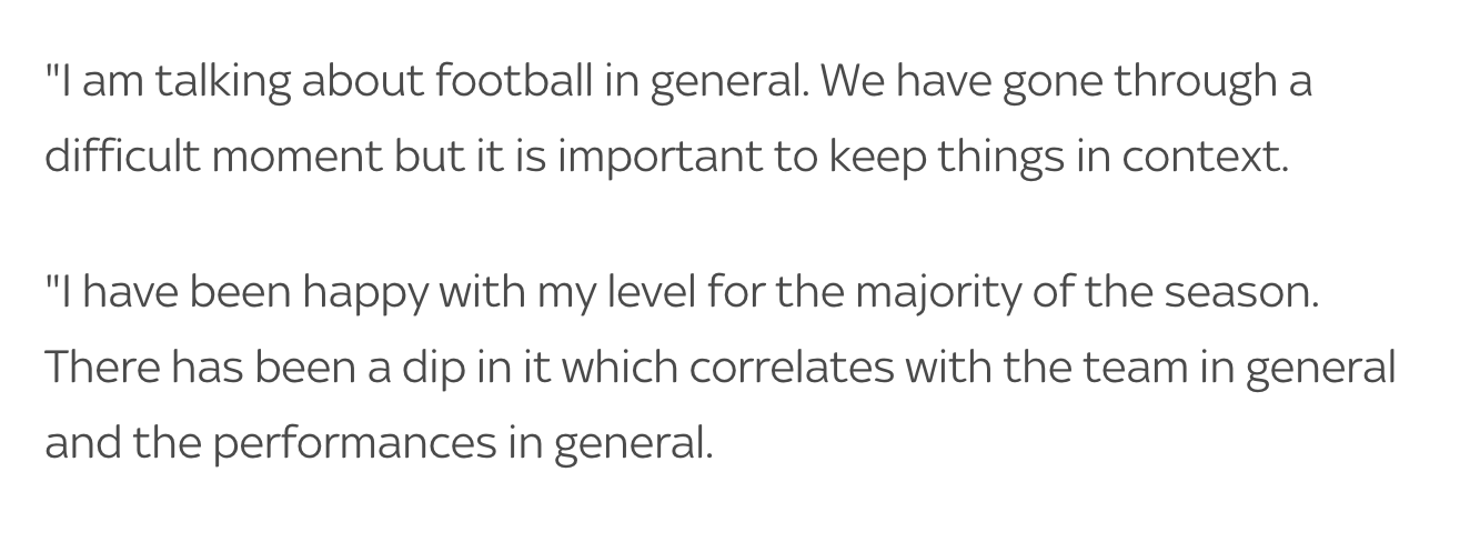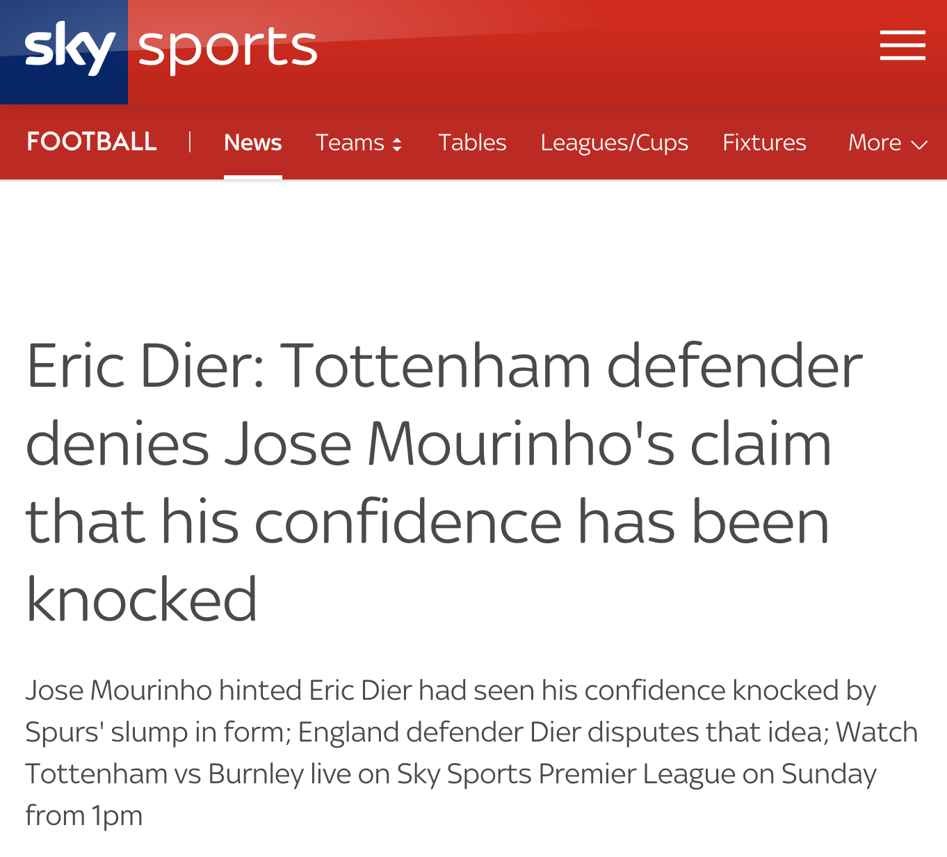 [요약] 다이어의 자신감이 떨어진 거 같다는 무리뉴의 말에 다이어는 동의하지 않는다. "나는 자신감이 부족하지 않은 상황이고, 자신감이 떨어져 본 적이 있어서 알 수 있다. 나는 올 시즌 나의 레벨에 만족합니다."