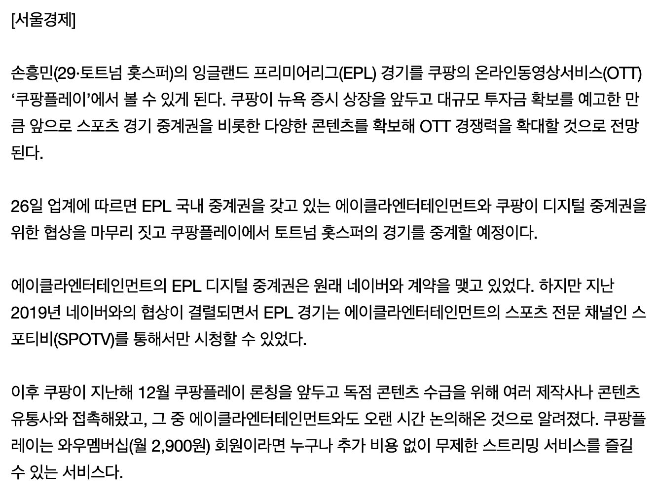 | 손흥민 EPL 경기, 쿠팡 플레이에서 본다 | |