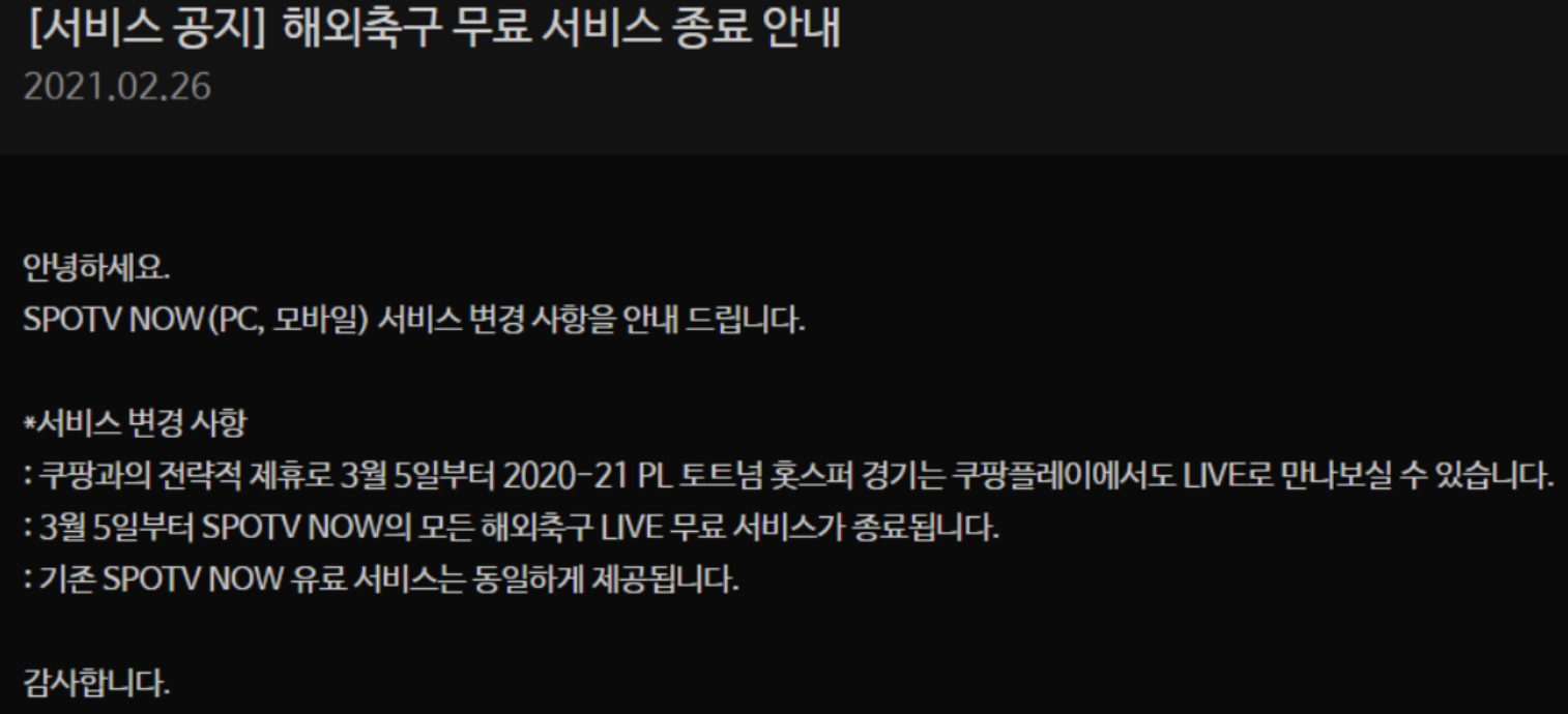 (스포티비에서 무료로 중계하던 토트넘, 라이프치히, 발렌시아, 프라이부르크 경기는 모두 유료로 전환)