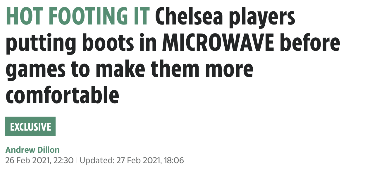 첼시는 원정 경기를 갈 때 구단 전자렌지를 가지고 간다. 클럽 관계자에 따르면 "현대 축구화는 끈이 없게 설계되다 보니 타이트하게 발을 잡아주도록 제작되는 것 같습니다. 그래서 겨울에 축구화를 신기 힘들고 뻣뻣합니다. 선수들은 전자렌지에 1~2분 축구화를 돌린 후에 신습니다. 중요한 과정입니다."라고 말했다.