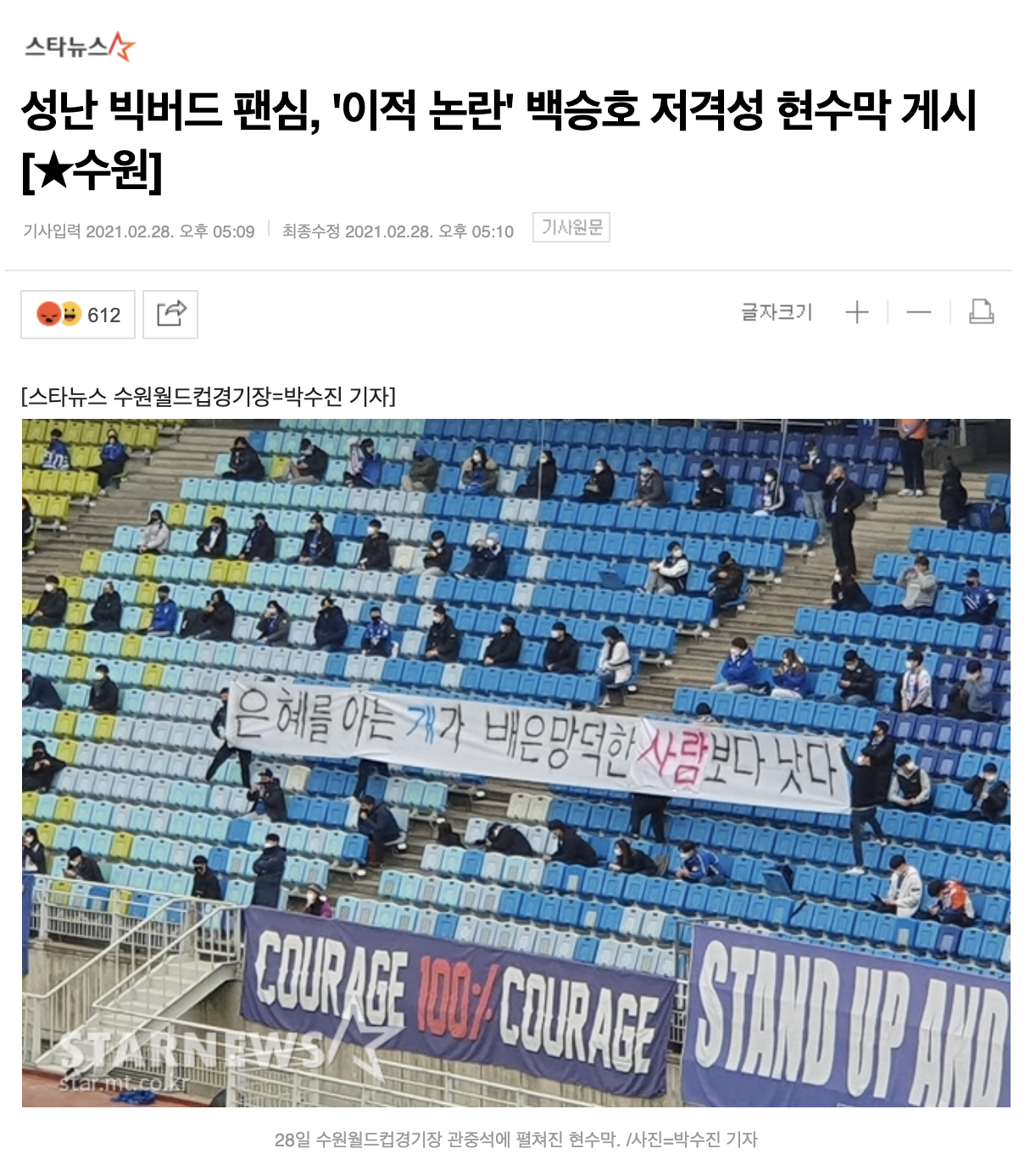 | 수원 월드컵 경기장에 등장한 '백승호 저격 현수막' | |
