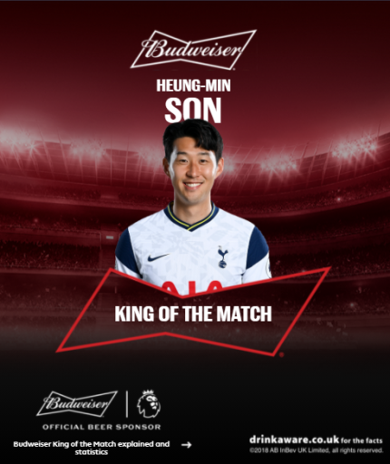 20-21 버드와이저 KOTM은 경기 종료 후 15분 동안 프리미어리그 홈페이지와 모바일 앱에서 팬 투표로 선정한다. 손흥민은 전체 투표 수 2만3729표 중 절반이 넘는 55.3%를 받았다. 베일은 39.3%로 2위에 그쳤으며 나란히 1골씩 올린 해리 케인과 루카스 모우라는 10위권에 없다.