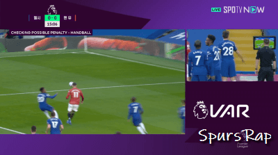 핸드볼 선언됐드면 PK인 상황. 하지만 VAR 결과 노 핸드볼 선언됨