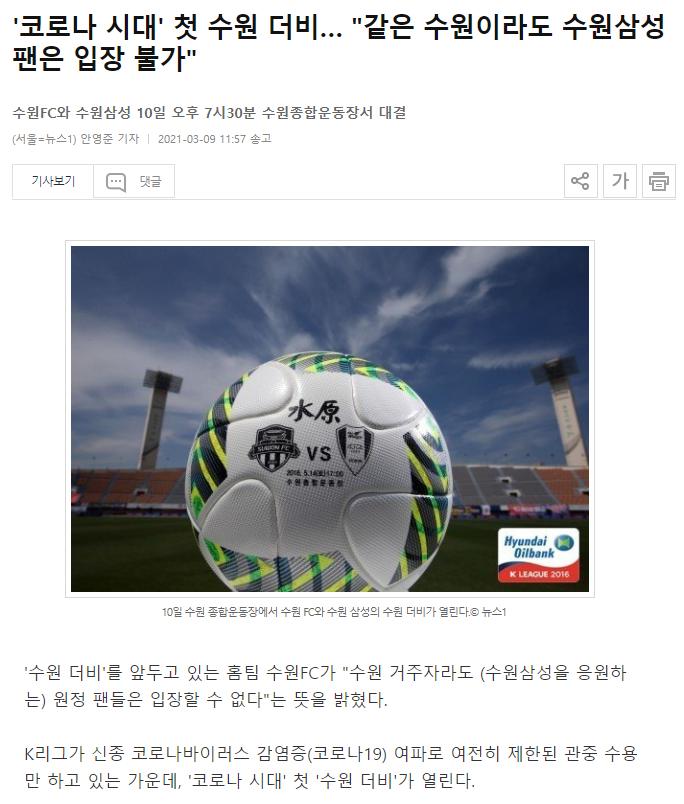 ['코로나 시대' 첫 수원 더비, "… 수원삼성팬은 입장 불가"]