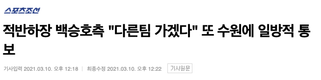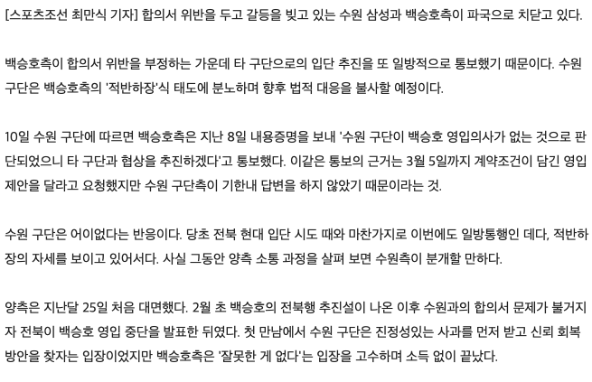 백승호측 "다른팀 가겠다" 수원에 일방적 통보