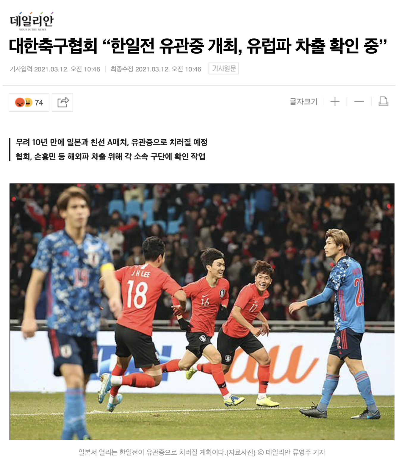 일본에서 열리는 한일전, 유관중 경기로 개최 예정