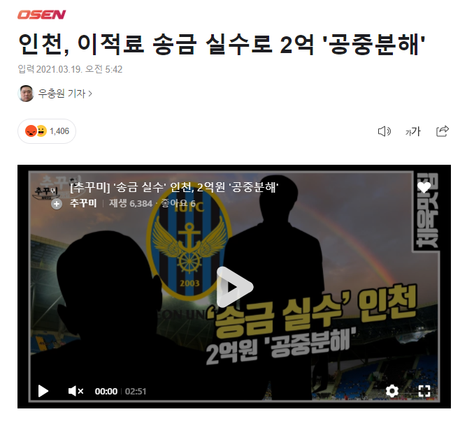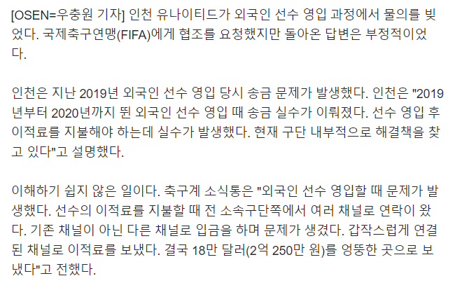 | 인천, 이적료 송금 실수로 2억 '공중분해' | |